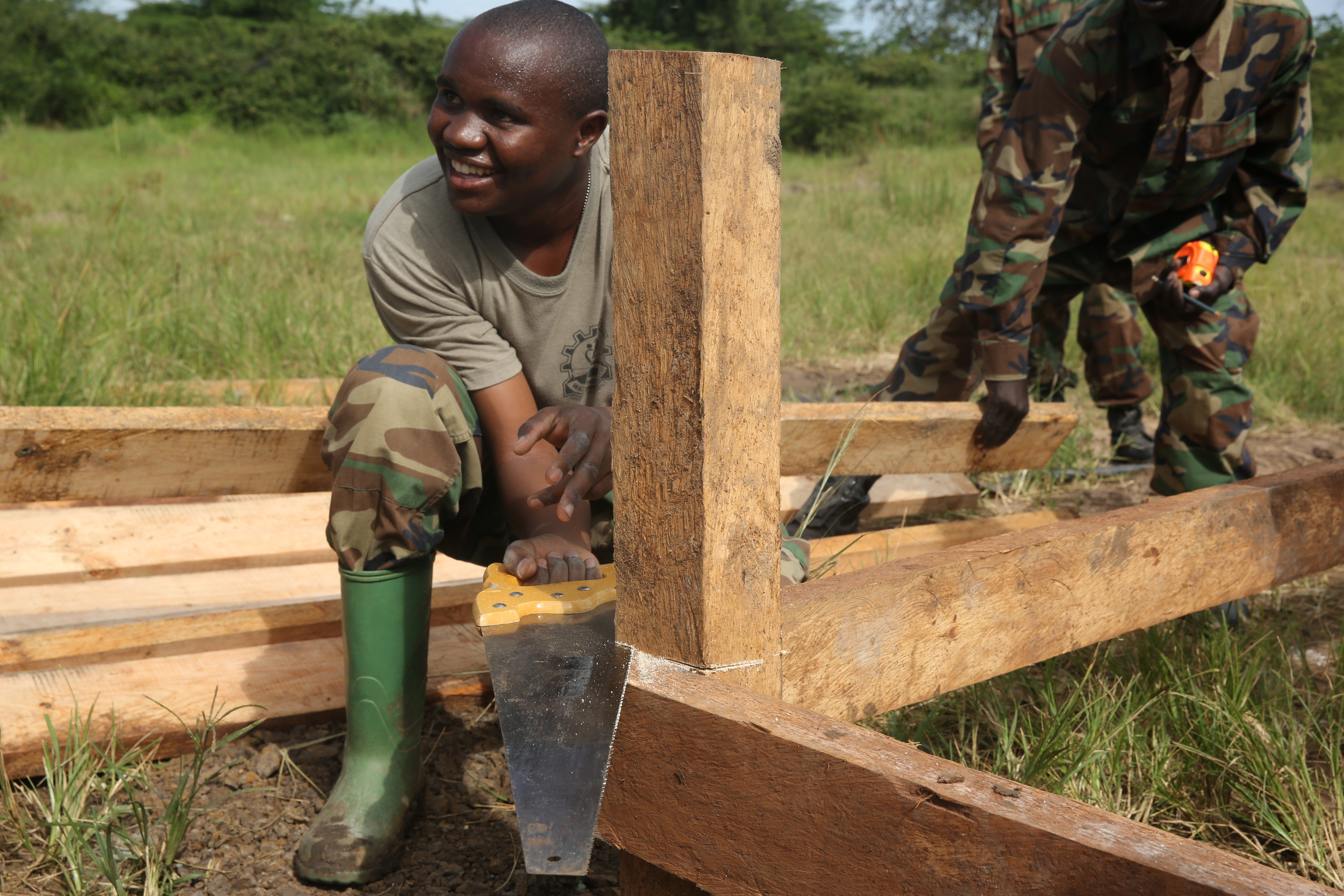 A Uganda People’s Defense Force soldier saws the top of a post in preparation to finish the flooring during a civil engineering exercise at Camp Singo, Nov. 16, 2015. The exercise helps the partner nations fortify their civil engineering skills while strengthening the bond between the two. (U.S. Marine Corps photo by Cpl. Olivia McDonald/Released)