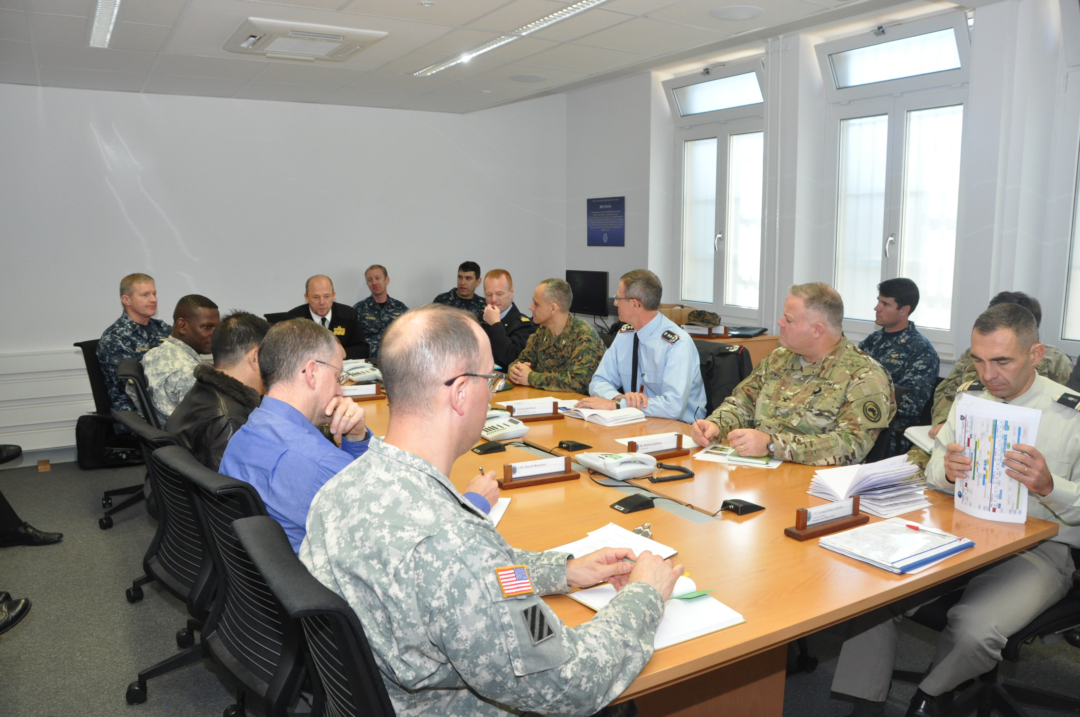 The EU’s deputy director general of military staff Rear Adm. Waldemar Gluszko, addresses AFRICOM and EUMS staff during a roundtable discussion.