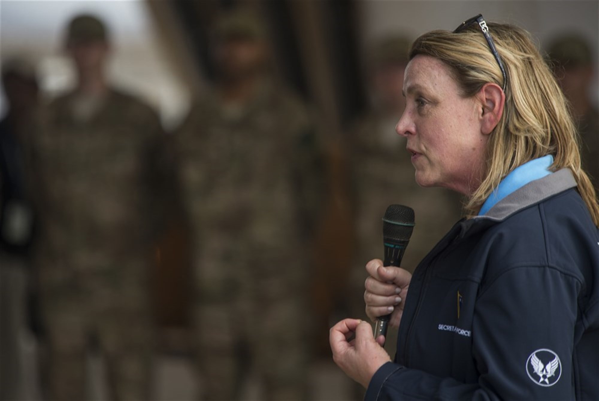 Secretary of the Air Force Deborah Lee James speaks to a group of Airmen at Chebelley Airfield, Djibouti, Nov.12, 2015. During her visit, James spoke at an all-call where she answered Airmen's questions and provided updates about current issues around the Air Force.