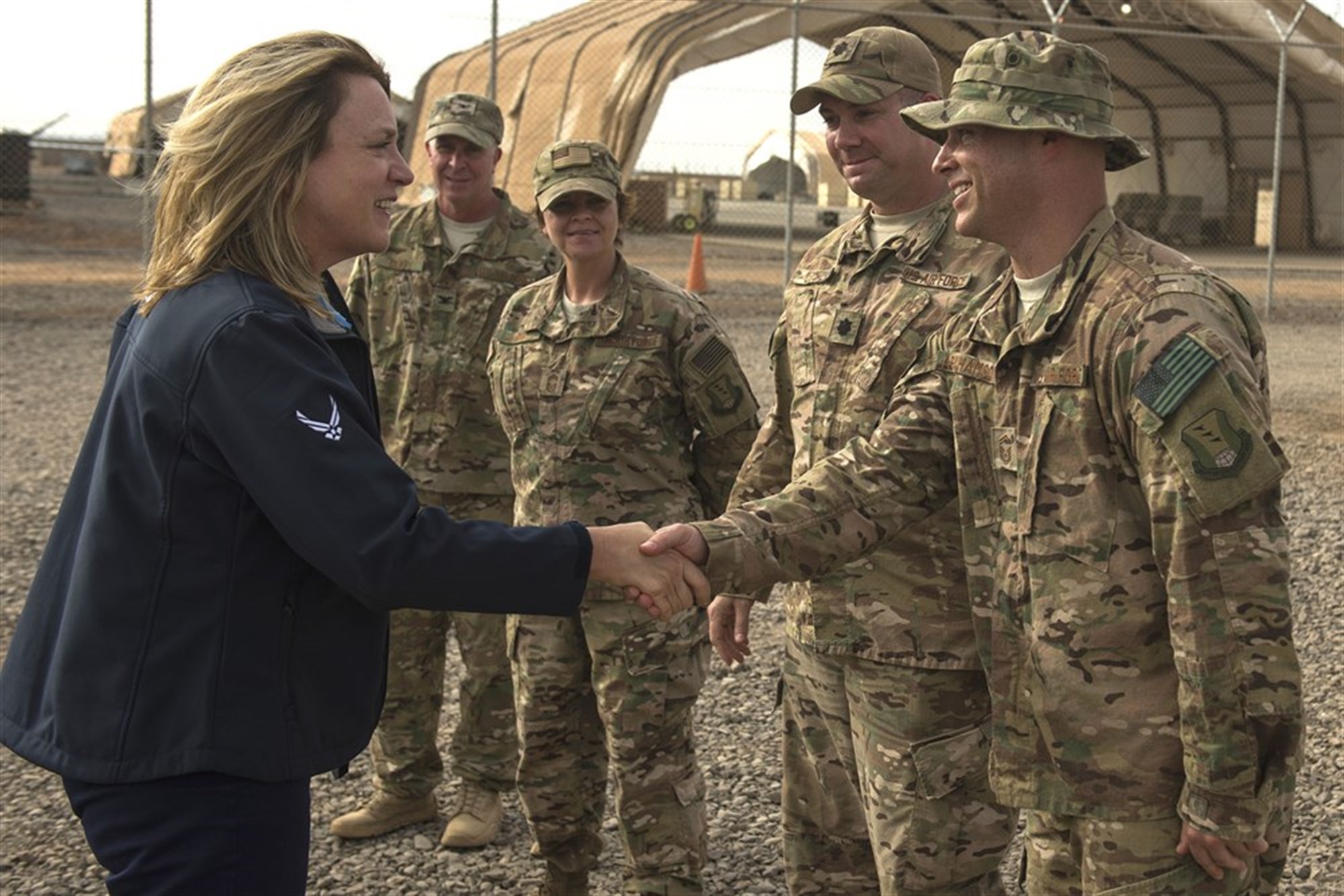 Secretary of the Air Force Deborah Lee James greets Chebelley Airfield leadership, Nov. 12, 2015. During her visit to Chebelley and Camp Lemonnier, James interacted with Airmen across a wide spectrum of career fields as she learned about the critical operations in each location.