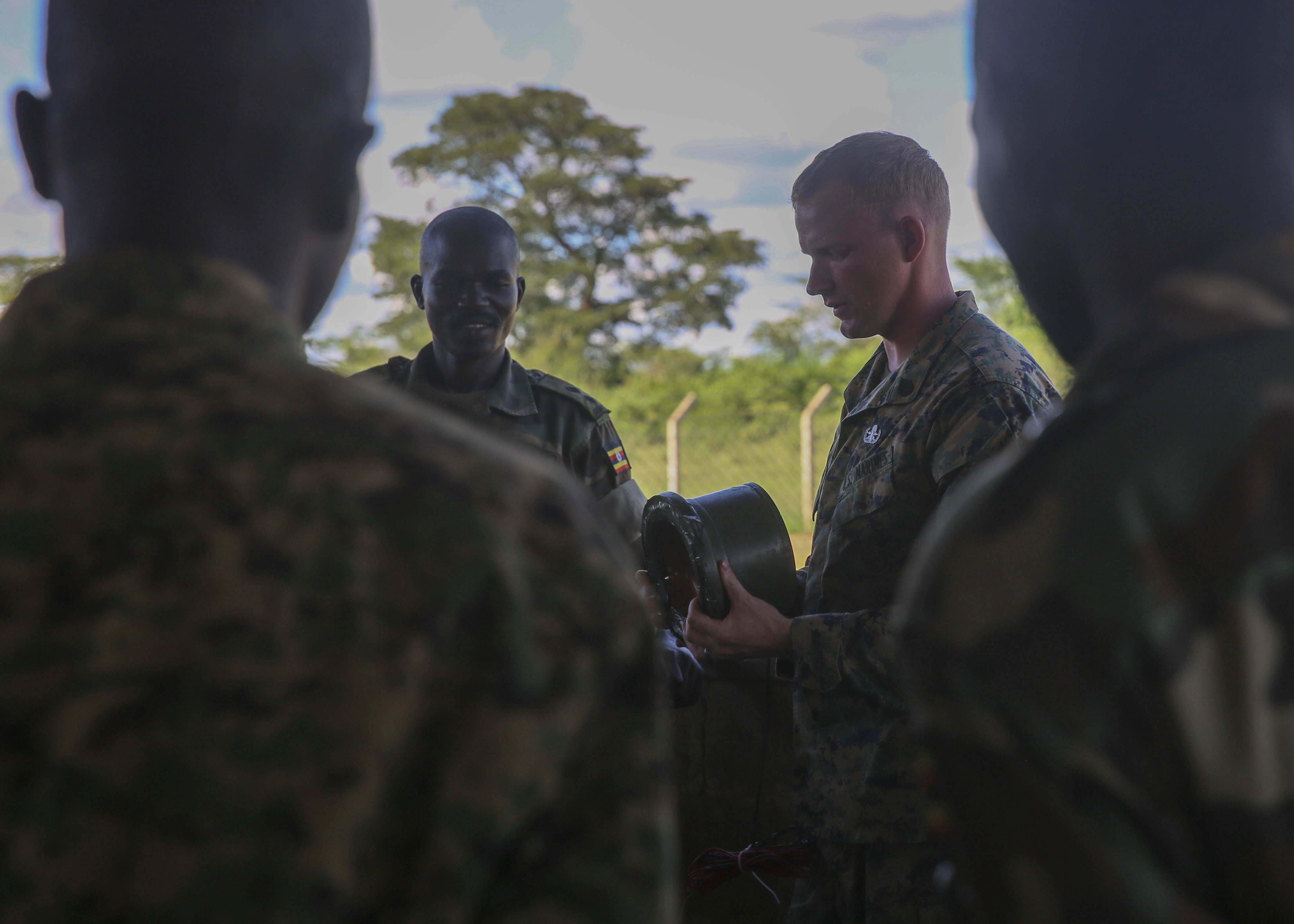 U.S. Marine Staff Sgt. Evan Crowgey, an explosive ordnance disposal technician with Special-Purpose Marine Air-Ground Task Force Crisis Response-Africa, conducted an improvised explosive device awareness class with the Uganda People’s Defense Force at Camp Singo, Uganda, Nov. 2, 2015. Marines and sailors with SPMAGTF-CR-AF are training with the UPDF to increase engineering and logistical capabilities while strengthening the bonds between the partner counties. (U.S. Marine Corps photo by Cpl. Olivia McDonald/Released)