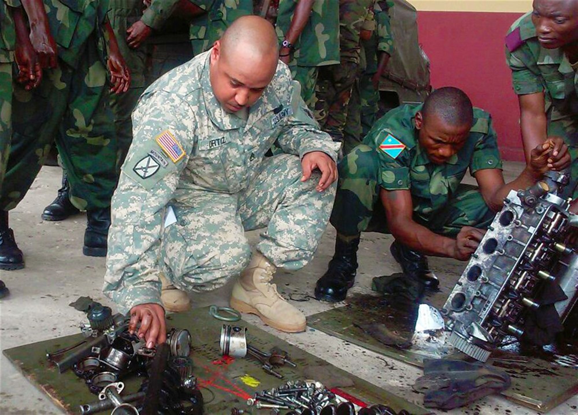 U.S. Army Africa's role in supporting training through the Democratic Republic of Congo's Defense Logistics School is an example of how AFRICOM can increase the capacity of partner nations to provide logistics support to their own forces. Here, Staff Sgt. Roberto Ortiz, a wheeled vehicle mechanic from AFRICOM’s Regionally Aligned Force, 3rd Brigade, 1st Armored Division from Fort Bliss, Texas, provides assistance to a DRC student rebuilding a light truck engine during hands on training at the DRC Logistics School. (U.S. Army Africa photo)