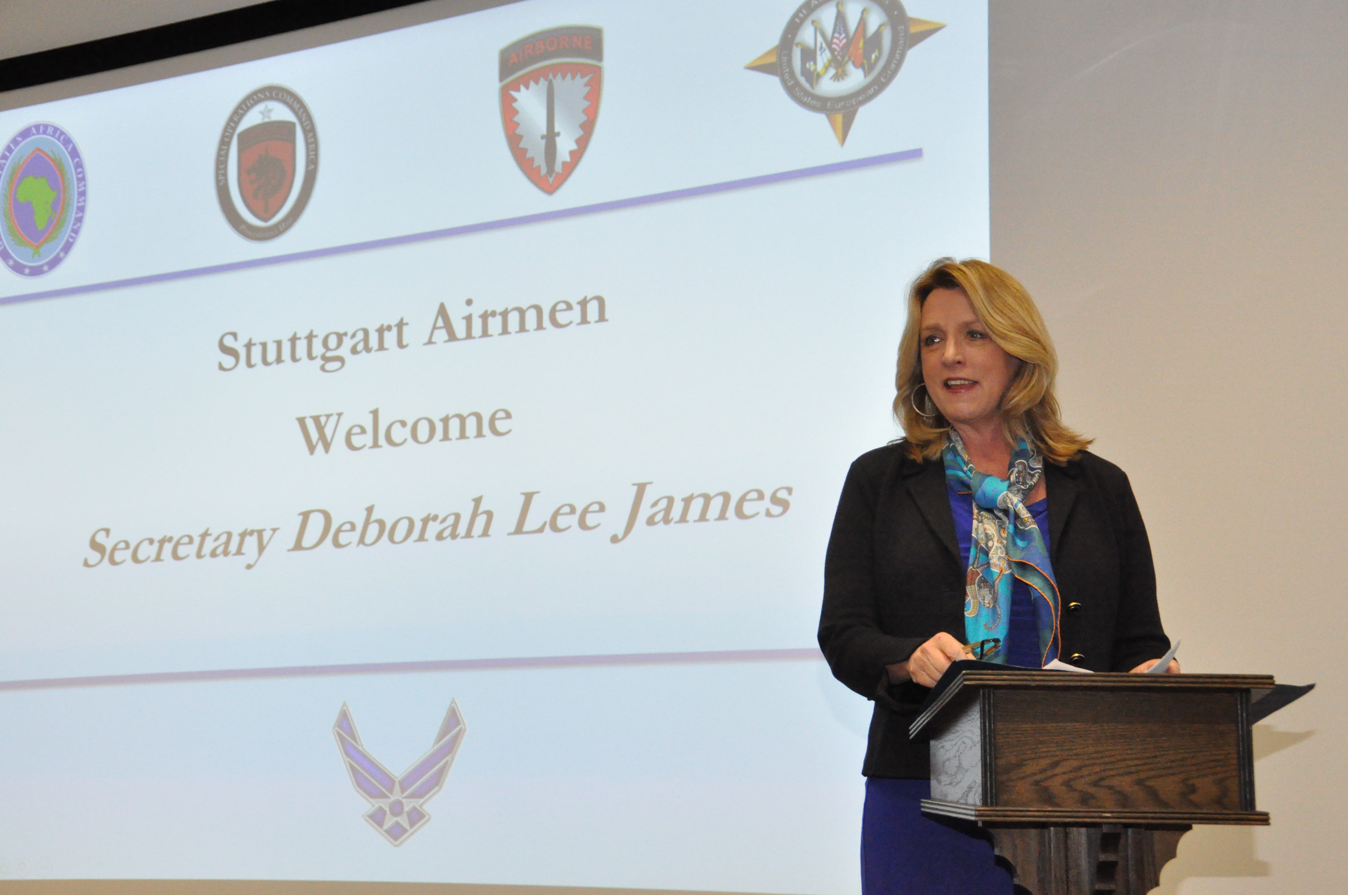 Secretary of the Air Force Deborah Lee James discusses her top priorities with Airmen stationed in Stuttgart, Germany, Nov. 18, 2015. (U.S. Africa Command photo by Brenda Law/RELEASED)