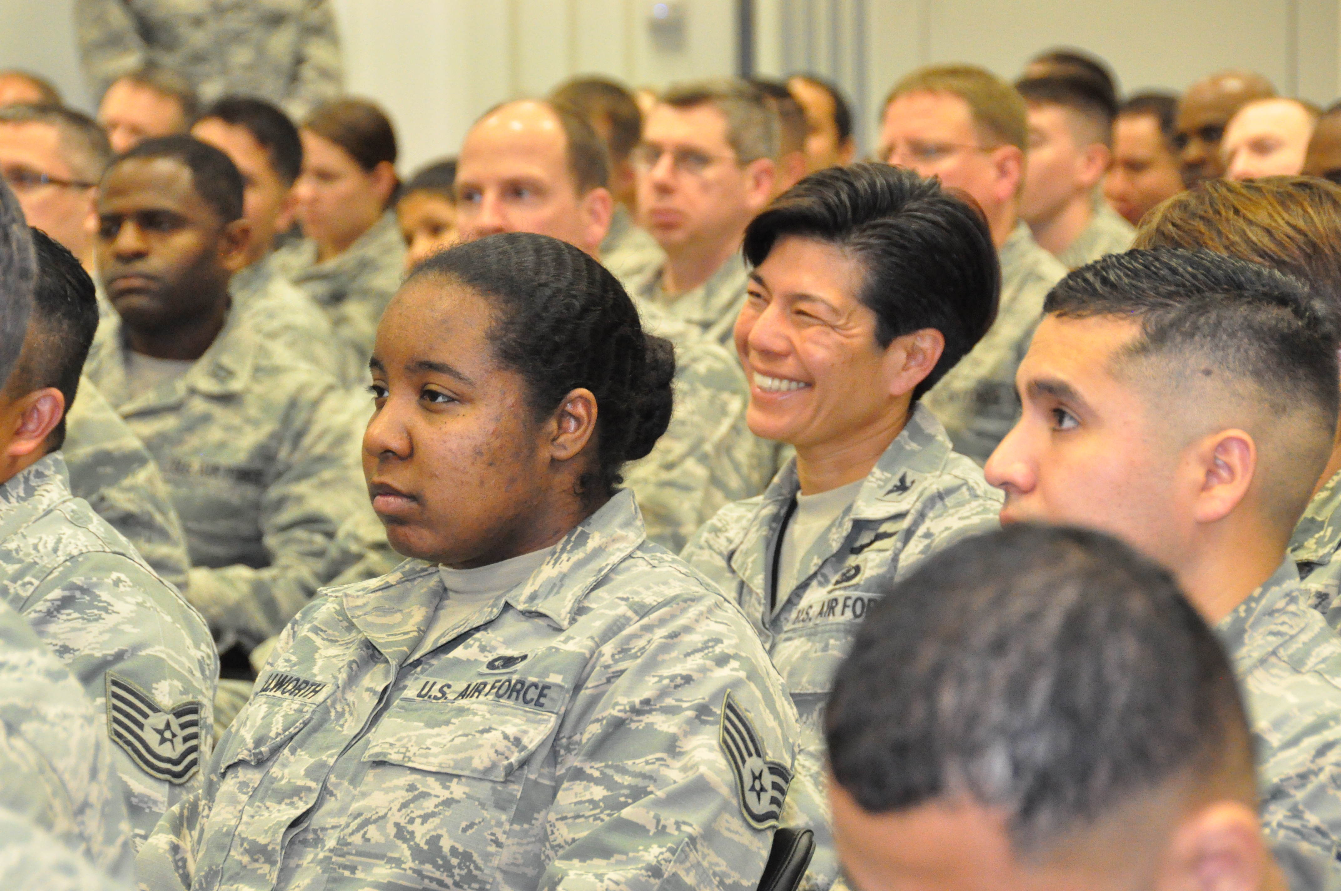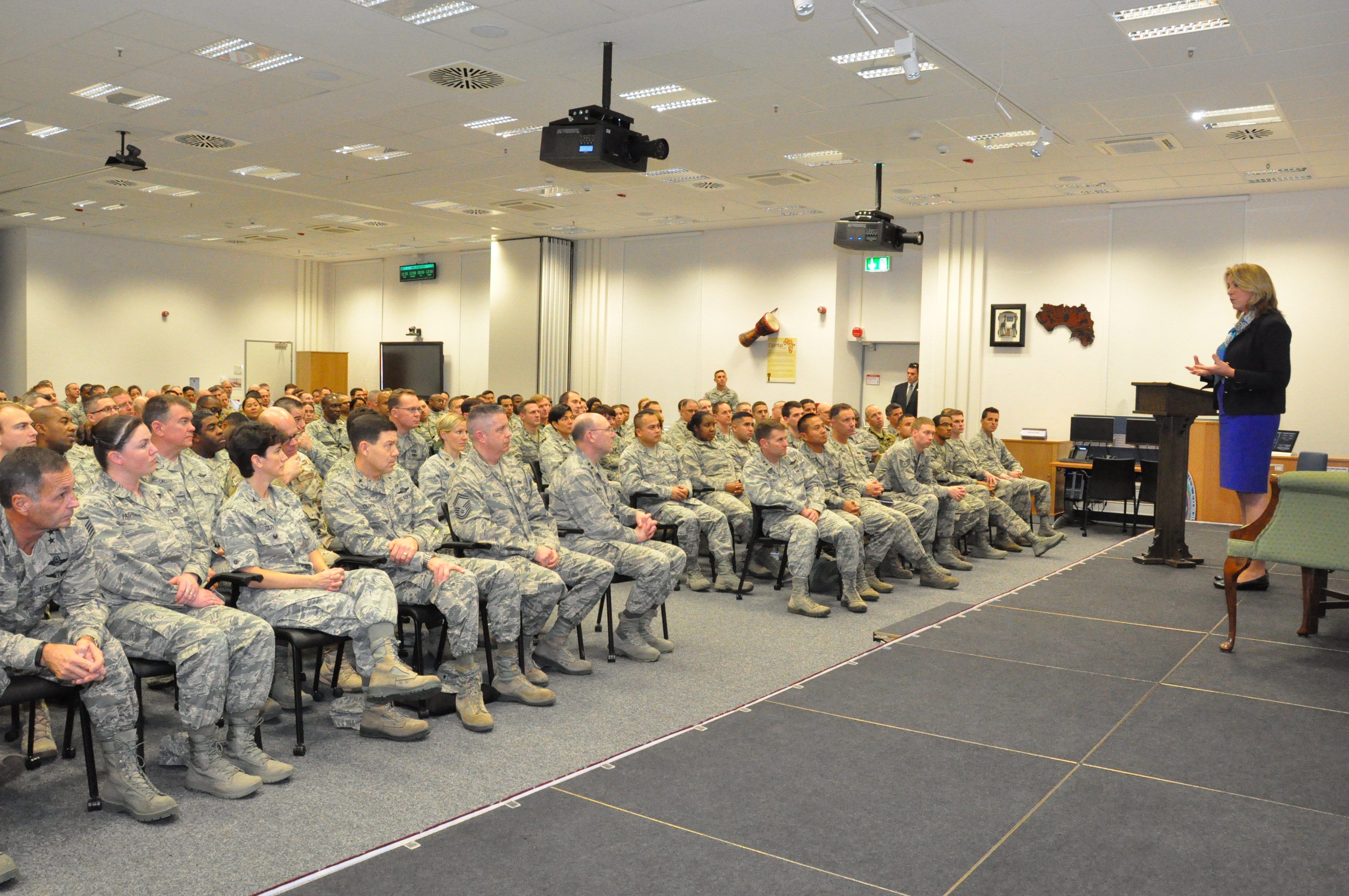U.S. Airmen stationed in Stuttgart, Germany attend an Airmen's Call with Secretary of the Air Force Deborah Lee James. More than 150 Airmen were able to hear about the Secretary's top priorities for the Air Force, and to engage in a question-and-answer session on Nov. 18, 2015. (U.S. Africa Command photo by Brenda Law/RELEASED)
