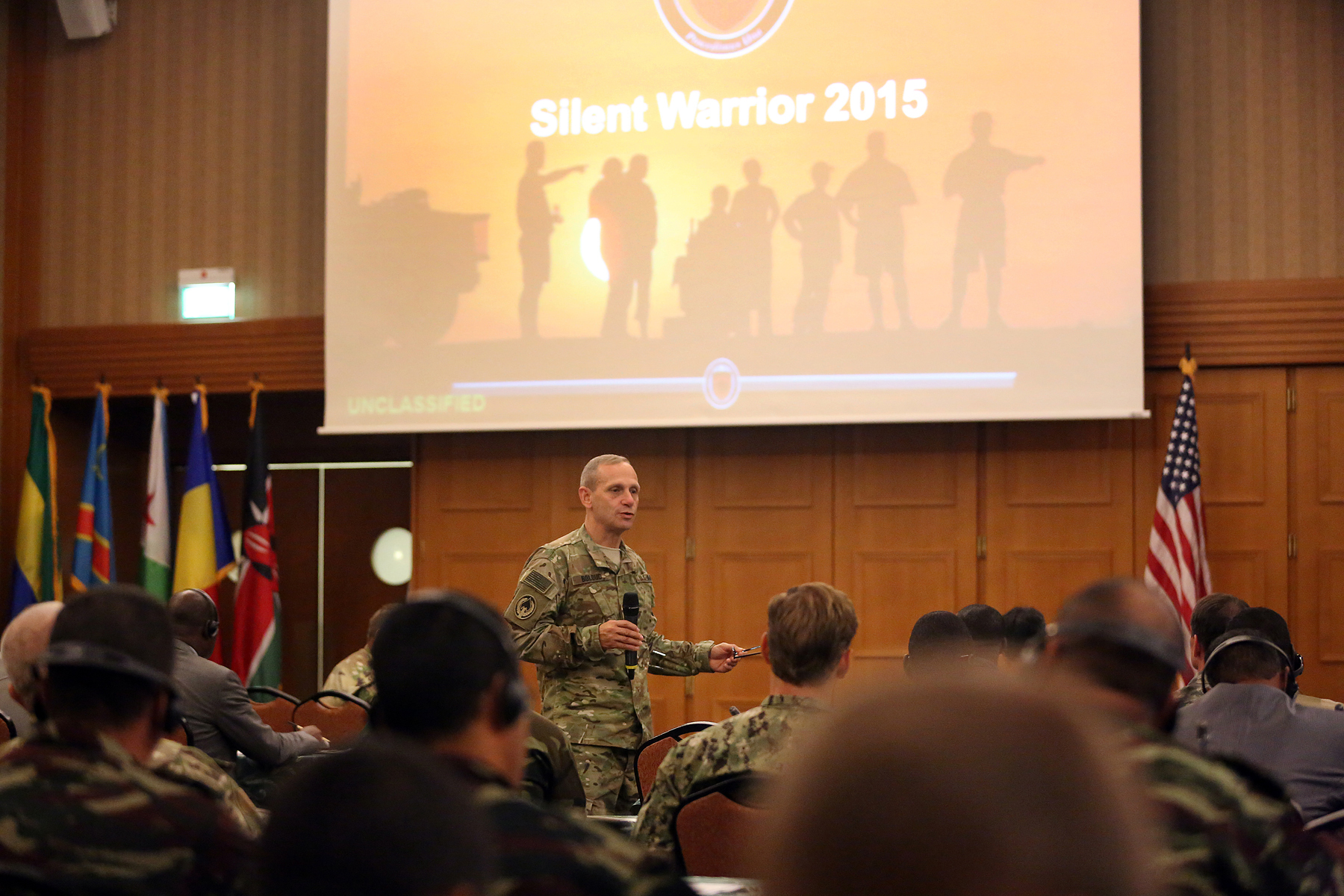 U.S. Army Brig. Gen. Donald Bolduc, Special Operations Command – Africa Commander, addresses U.S. and African participants at exercise Silent Warrior 16, held from Nov. 9-13, in Garmisch, Germany. Silent Warrior 16 brought together Special Operations Forces and representatives from 19 African states to discuss cooperative strategies to combat violent extremist organizations in the region.