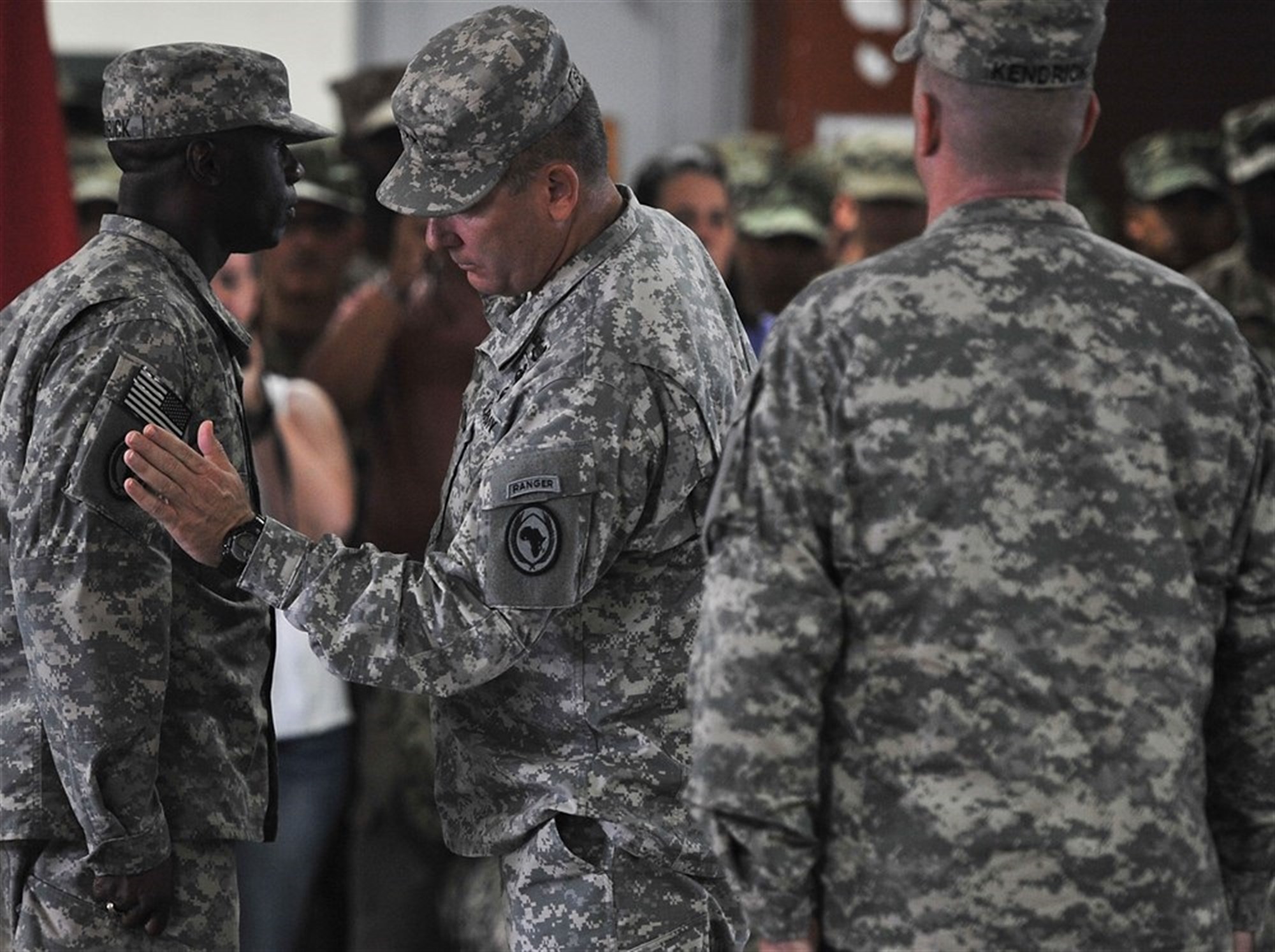 U.S. Maj. Gen. Mark Stammer, Combined Joint Task Force-Horn of Africa commanding general, presents Command Sgt. Maj. Butler Kendrick Jr. with the U.S. Africa Command combat patch during a ceremony at Camp Lemonnier, Djibouti, Nov. 28, 2015. The soldiers assigned to CJTF-HOA are now authorized to wear the U.S. Africa Command patch for the duration of their careers. (U.S. Air Force photo by Tech. Sgt. Dan DeCook)