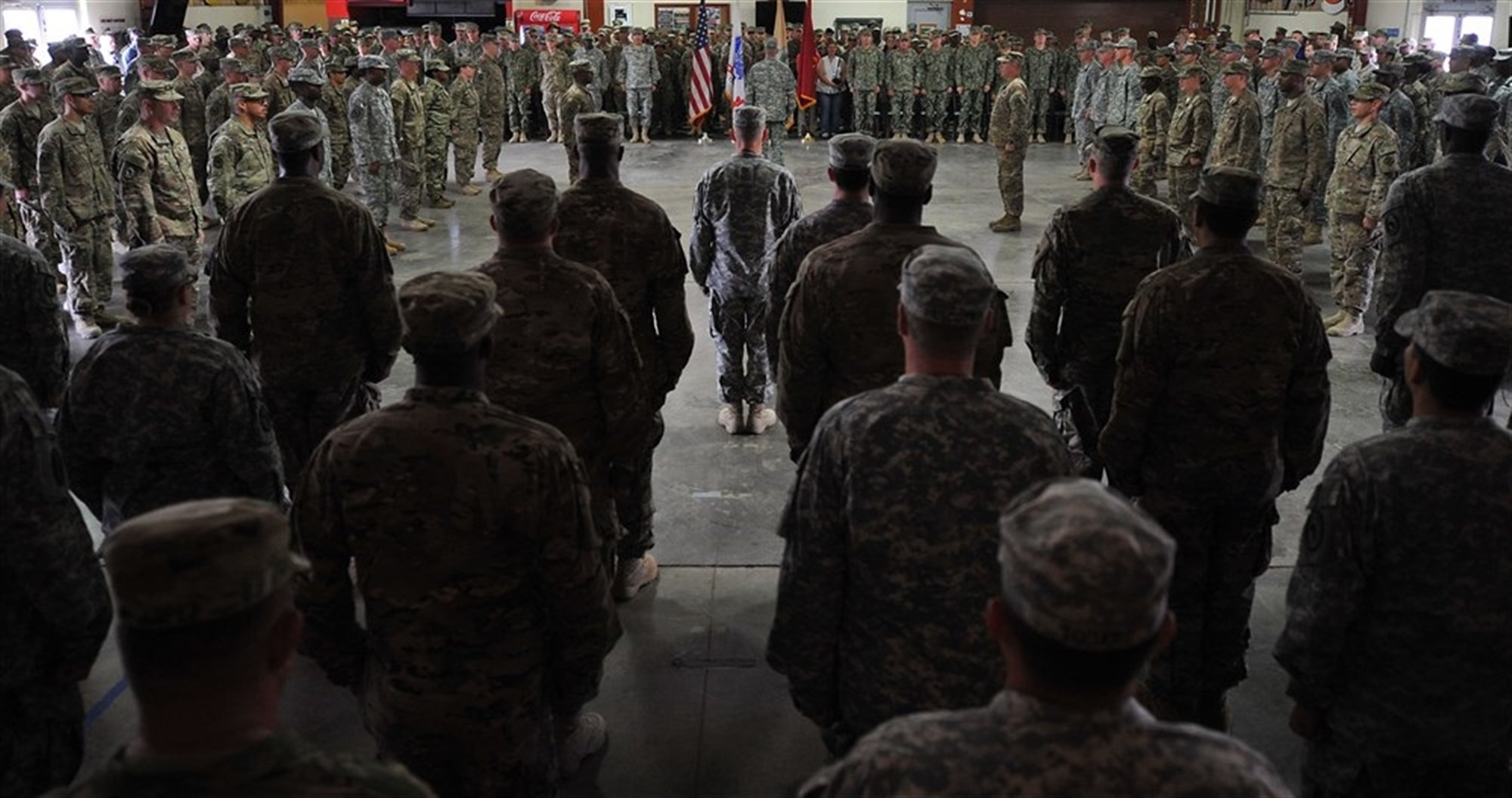 Soldiers assigned to Combined Joint Task Force-Horn of Africa are honored at a patching ceremony at Camp Lemonnier, Djibouti, Nov. 28, 2015. More than 150 soldiers were awarded their combat patch during the ceremony which has roots dating back to 1918. (U.S. Air Force photo by Tech. Sgt. Dan DeCook)