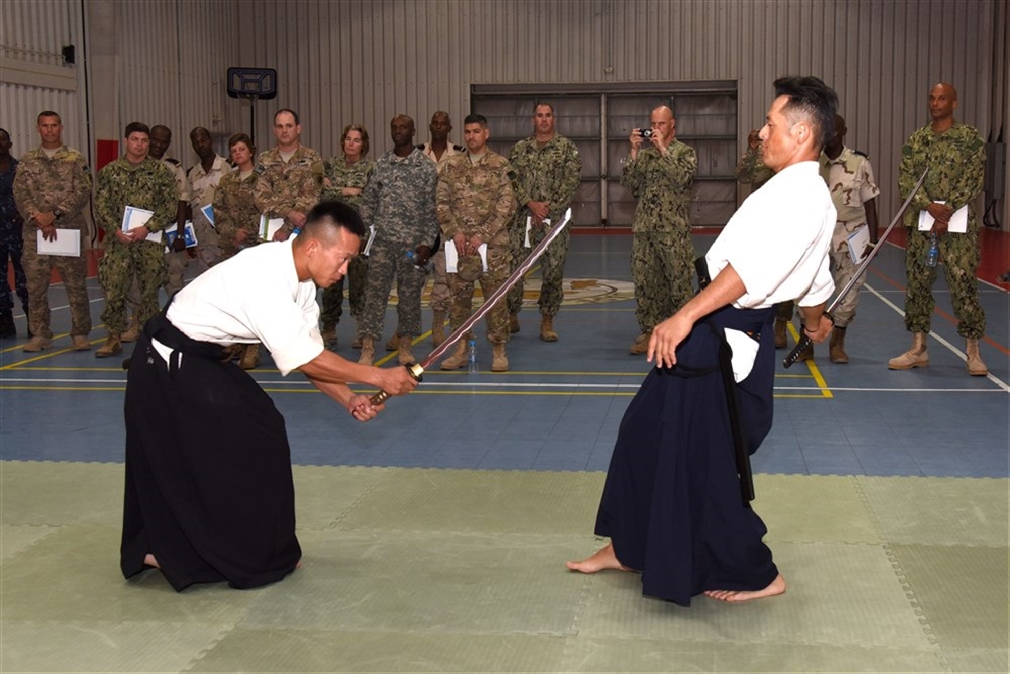 Participants from the Joint Forces Senior Enlisted Professional Development Course view a traditional swordsmanship demonstration at the Japanese base in Djibouti, Nov. 24, 2015. The Japan Self-Defense Forces hosted the second gathering of senior enlisted members to share their culture and mission. (U.S. Air Force photo by Staff Sgt. Victoria Sneed)