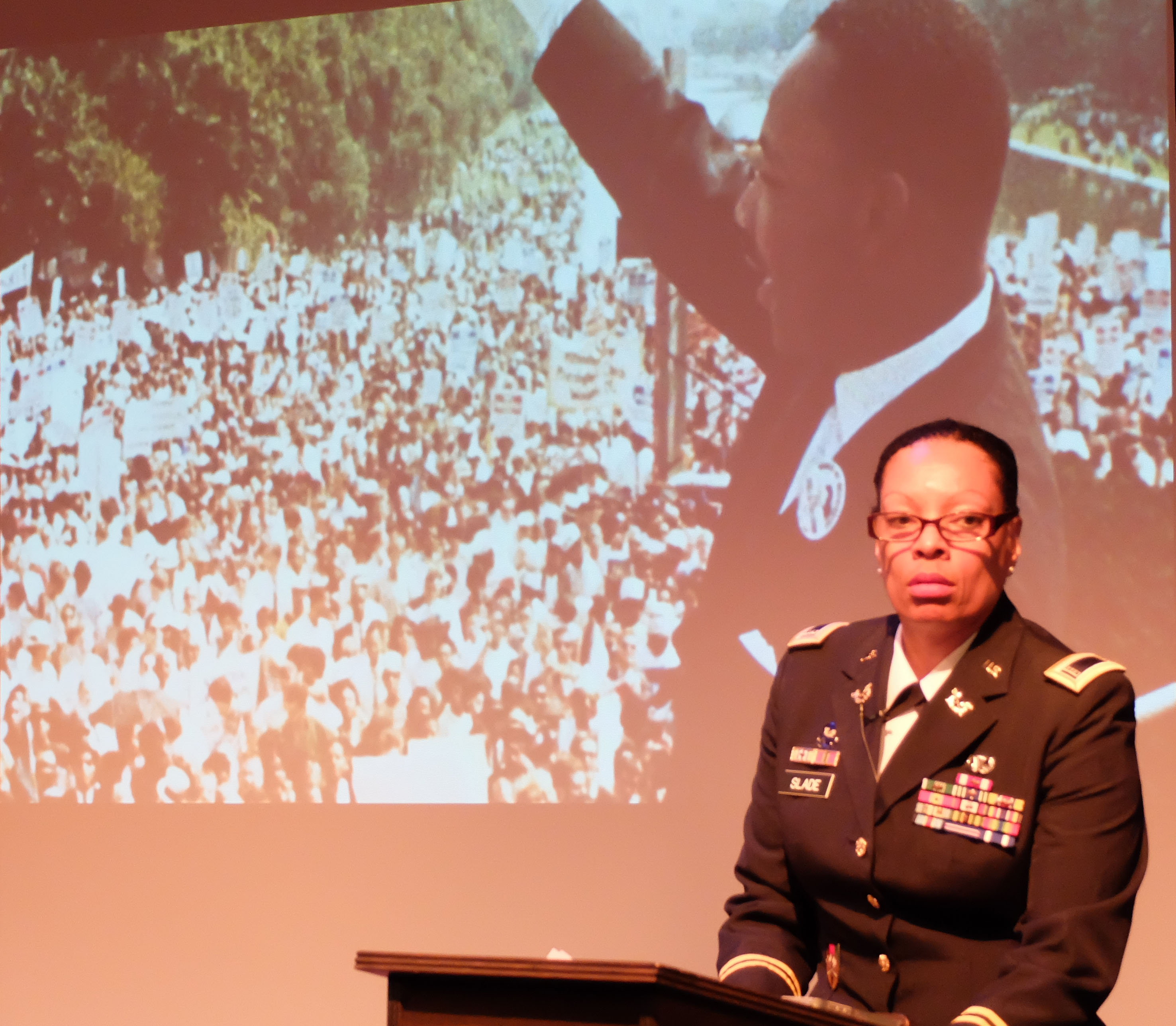 Lead planner and executor, U.S. Army Chief Warrant Officer Vickie Slade from U.S. Africa Command's legal office, narrates the program. “A Century of Black Life, History and Culture” served as the theme for this year’s Black History Month celebration, held at Kelley Barracks, U.S. Army Garrison Stuttgart, Feb. 26, 2015. Performances by the Patch High School and Stuttgart Gospel Service Choirs and a dance from the play “Her Stories” highlighted the accomplishments of African Americans over the past century. (U.S. Africa Command photos by Brenda Law/Released)