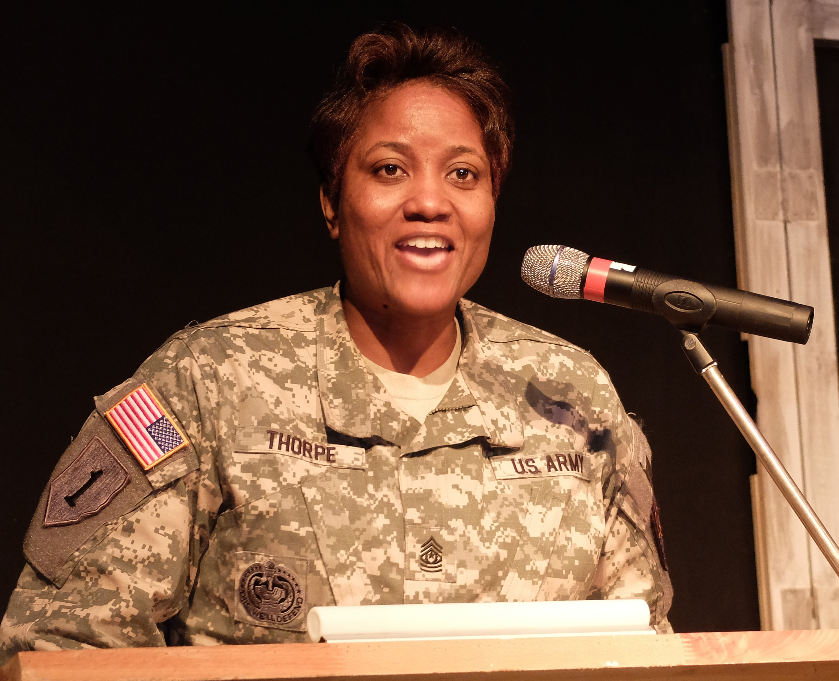 U.S. Army Garrison Command Sgt. Major Lynice Thorpe delivers remarks. “A Century of Black Life, History and Culture” served as the theme for this year’s Black History Month celebration, held at Kelley Barracks, U.S. Army Garrison Stuttgart, Feb. 26, 2015. Performances by the Patch High School and Stuttgart Gospel Service Choirs and a dance from the play “Her Stories” highlighted the accomplishments of African Americans over the past century. (U.S. Africa Command photos by Brenda Law/Released)