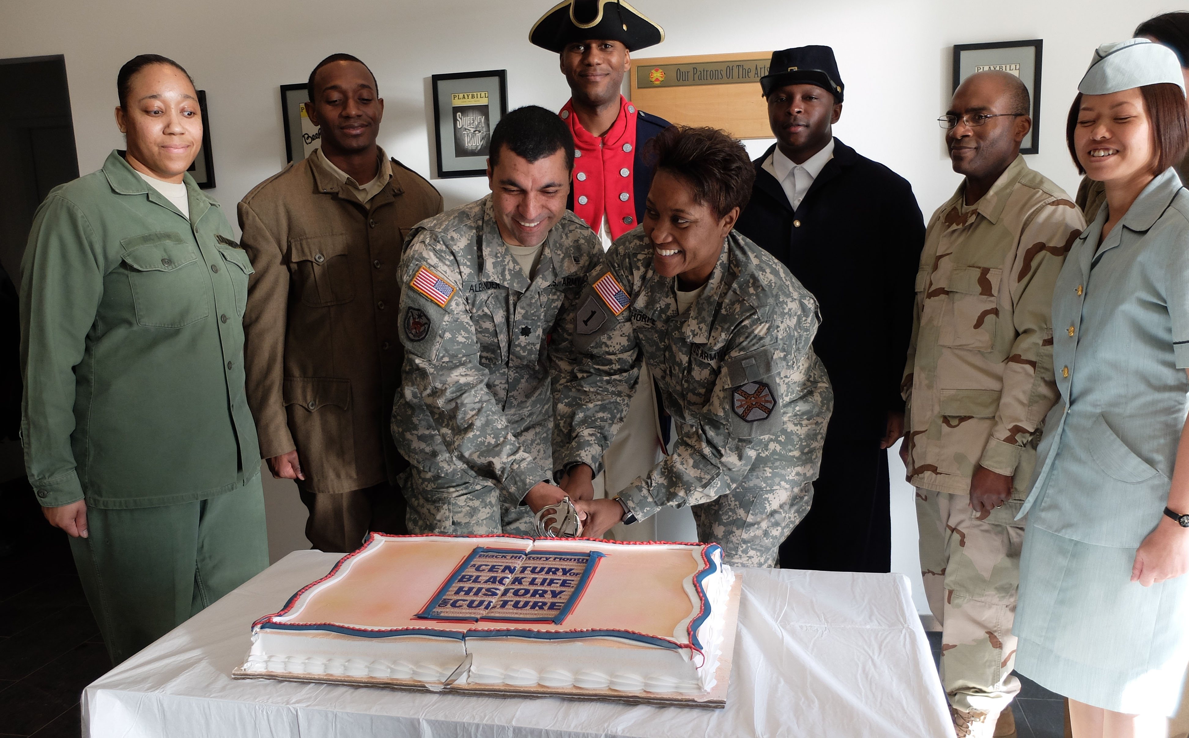 U.S. Army Garrison Command Sgt. Major Lynice Thorpe (right) and AFRICOM Headquarters Commandant, U.S. Army Lt. Col. Troy Alexander, cut the cake. “A Century of Black Life, History and Culture” served as the theme for this year’s Black History Month celebration, held at Kelley Barracks, U.S. Army Garrison Stuttgart, Feb. 26, 2015. Performances by the Patch High School and Stuttgart Gospel Service Choirs and a dance from the play “Her Stories” highlighted the accomplishments of African Americans over the past century. (U.S. Africa Command photos by Brenda Law/Released)
