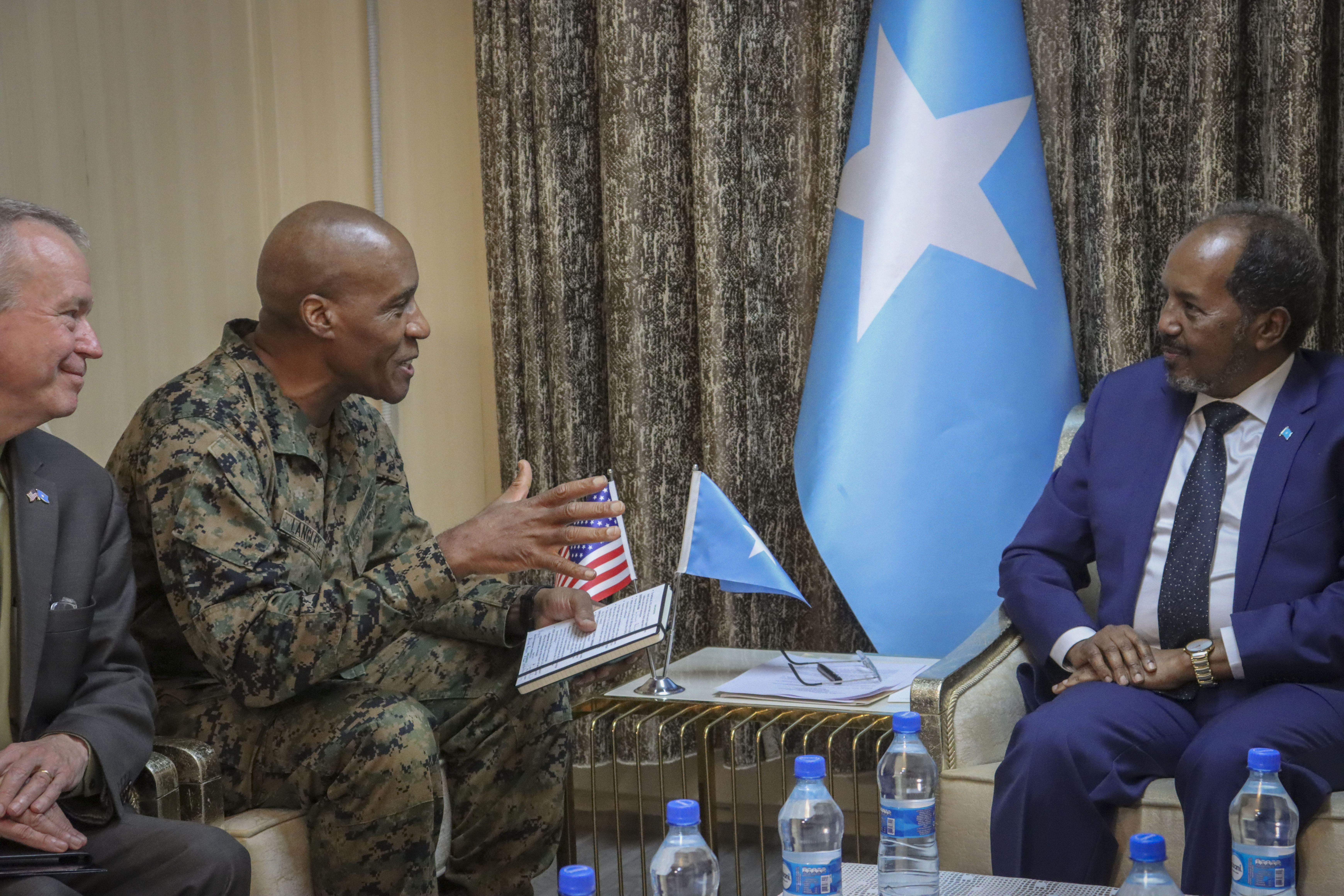 U.S. Marine Corps Gen. Michael Langley, commander, U.S. Africa Command, and Amb. Larry André, U.S. Embassy in Somalia, meet with Somalia President Hassan Sheikh Mohamud in Somalia on Aug. 29, 2022. The visit came as part of a four-day trip to Djibouti, Somalia, and Manda Bay, Kenya, from August 28-31, 2022, to meet with host nation leaders, senior interagency officials, and deployed troops to better understand the political and military situation in East Africa, discuss shared concerns and priorities, and see ongoing operations firsthand.