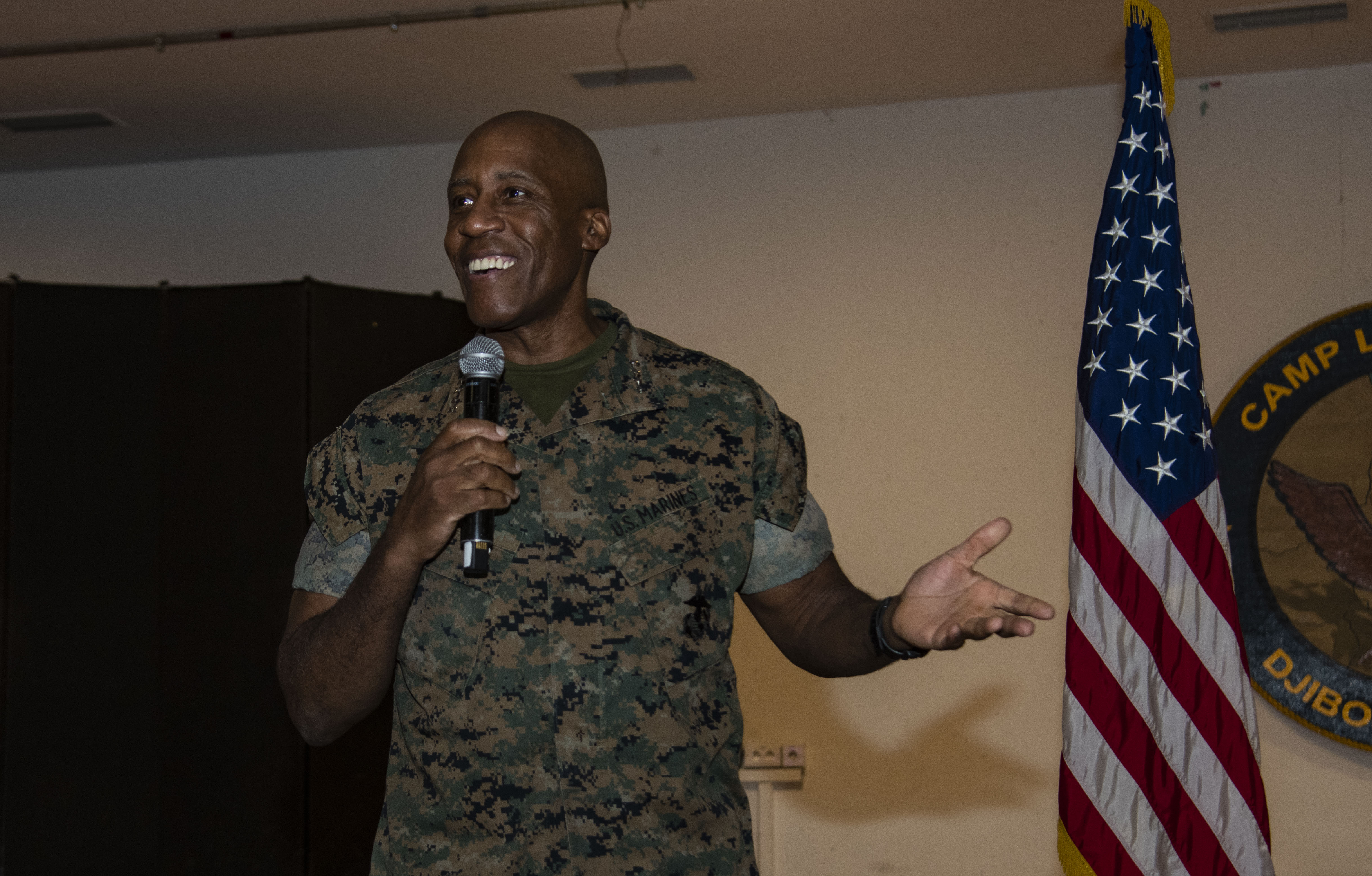 U.S. Marine Corps Sgt. Maj. Richard Thresher, command senior enlisted leader, U.S. Africa Command, speaks during an awards ceremony at Camp Lemonnier, Djibouti, Aug. 28, 2022. The visit came as part of a four-day trip by senior leaders to Djibouti, Somalia, and Manda Bay, Kenya, from August 28-31, 2022, to meet with host nation leaders, senior interagency officials, and deployed troops to better understand the political and military situation in East Africa, discuss shared concerns and priorities, and see ongoing operations firsthand.