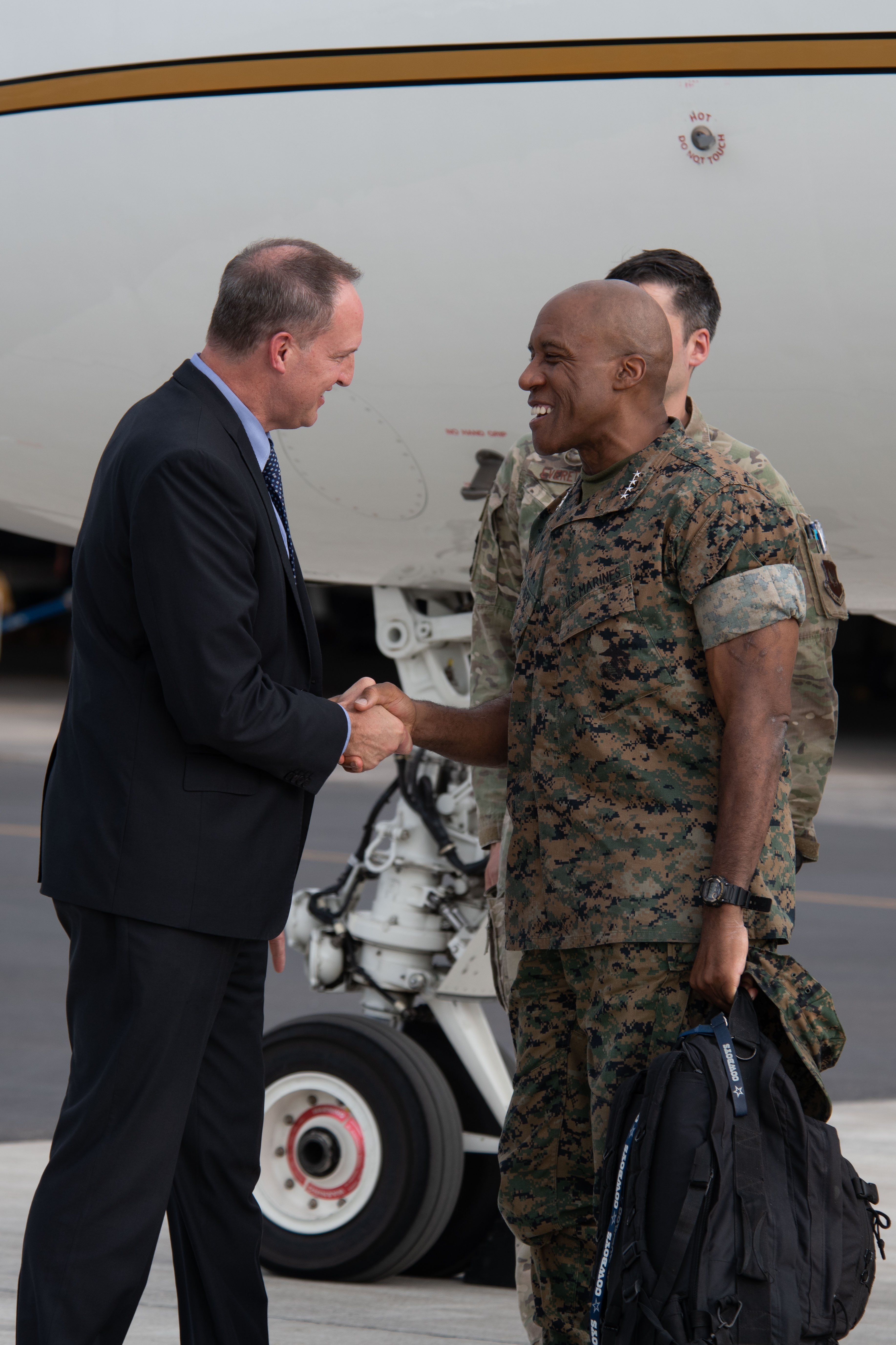 The Honorable Johnathan Pratt, U.S. ambassador to Djibouti, greets U.S. Marine Corps Gen. Michael Langley, commander, U.S. Africa Command, as he arrives at Camp Lemonnier, Djibouti, Aug. 28, 2022. The visit came as part of a four-day trip to Djibouti, Somalia, and Manda Bay, Kenya, from August 28-31, 2022, to meet with host nation leaders, senior interagency officials, and deployed troops to better understand the political and military situation in East Africa, discuss shared concerns and priorities, and see ongoing operations firsthand.